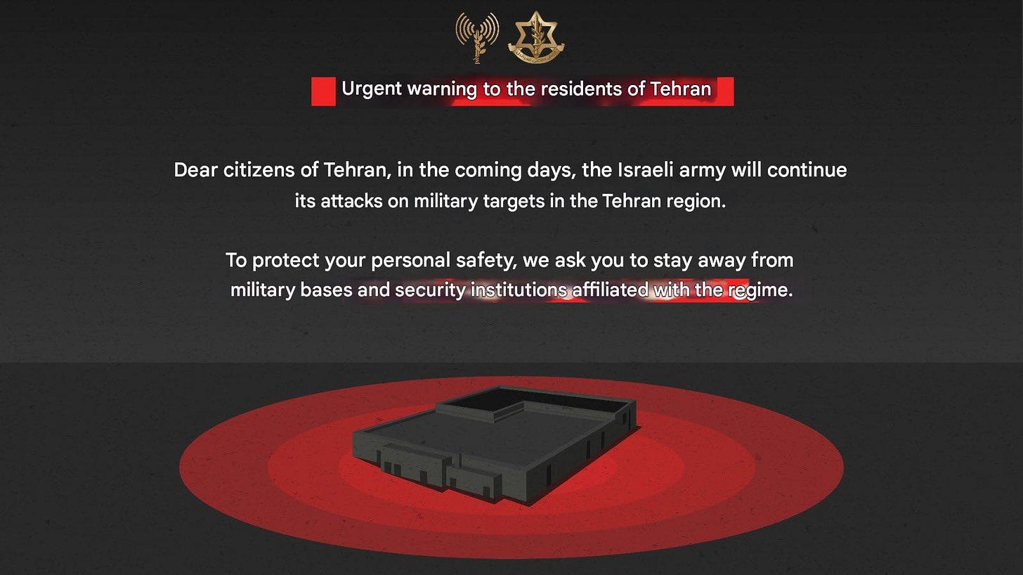 ISRAEL/IRAN - The Israeli military is issuing an "urgent warning" to citizens of Tehran: "In the coming days, the Israeli army will continue its attacks against military targets in the Tehran region."