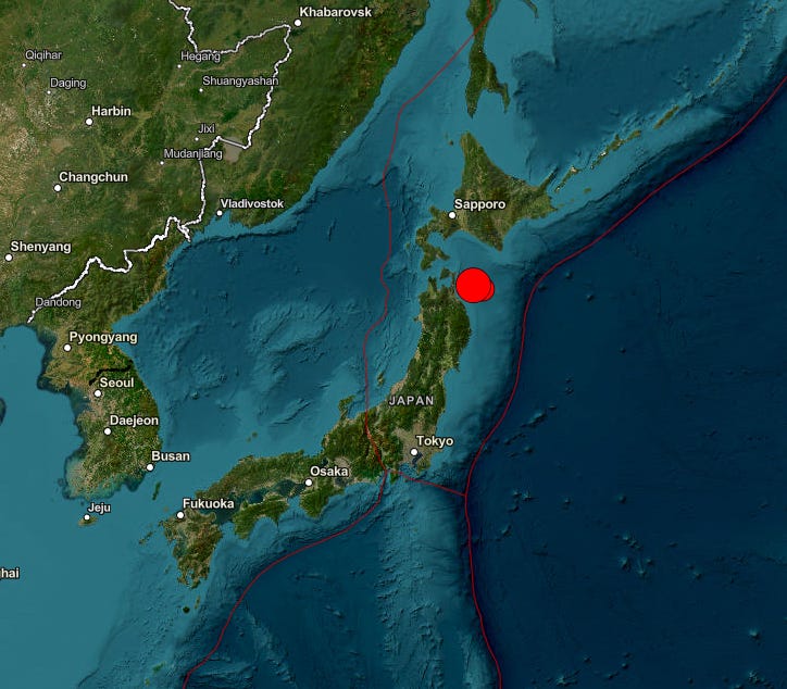EAST ASIA — A significant earthquake with a preliminary magnitude of 7.6 struck the Hokkaido region of Japan at 2:15 p.m. UTC on December 8. The epicenter was located at approximately 41.0 degrees north latitude and 142.3 degrees east longitude, at a depth of 31.7 miles (51 kilometers).