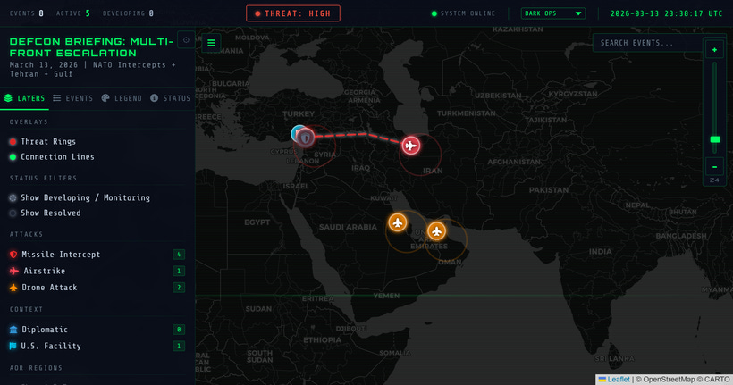 MIDDLE EAST / EUROPE. NATO air and missile defense systems intercepted a third Iranian ballistic missile in Turkish airspace early on March 13, with debris falling in Hatay province in southern Turkey, according to Turkey’s Ministry of National Defense.