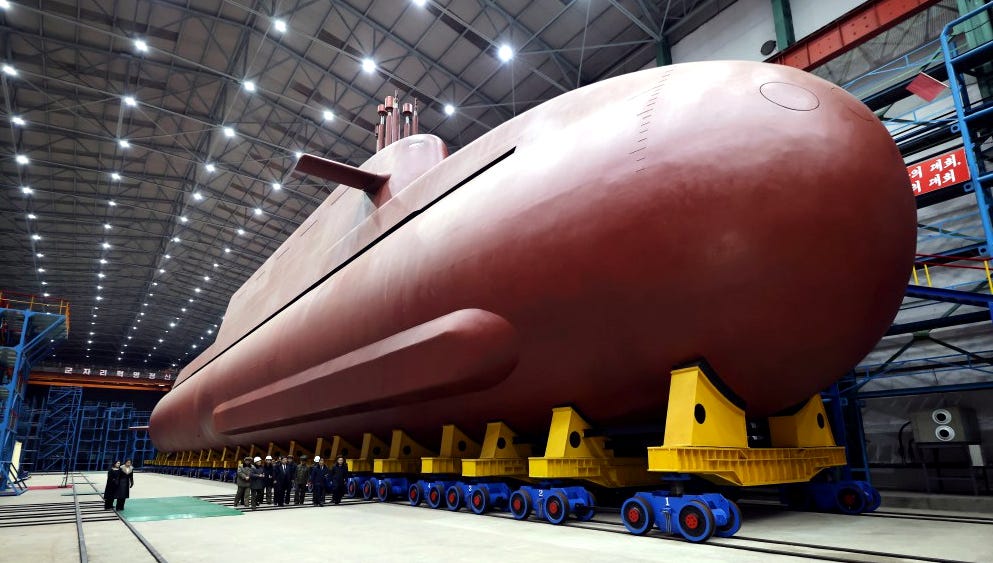 Kim Jong Un inspected the ongoing construction of an 8,700-ton nuclear-powered strategic guided missile submarine at a warship-building facility.