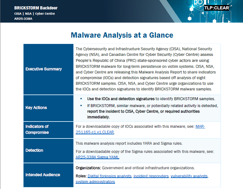 Analysis of eight samples reveals variants for VMware vSphere and Windows. The joint Malware Analysis Report provides indicators of compromise and detection signatures. Network defenders are urged to scan for BRICKSTORM using provided YARA and Sigma rules.