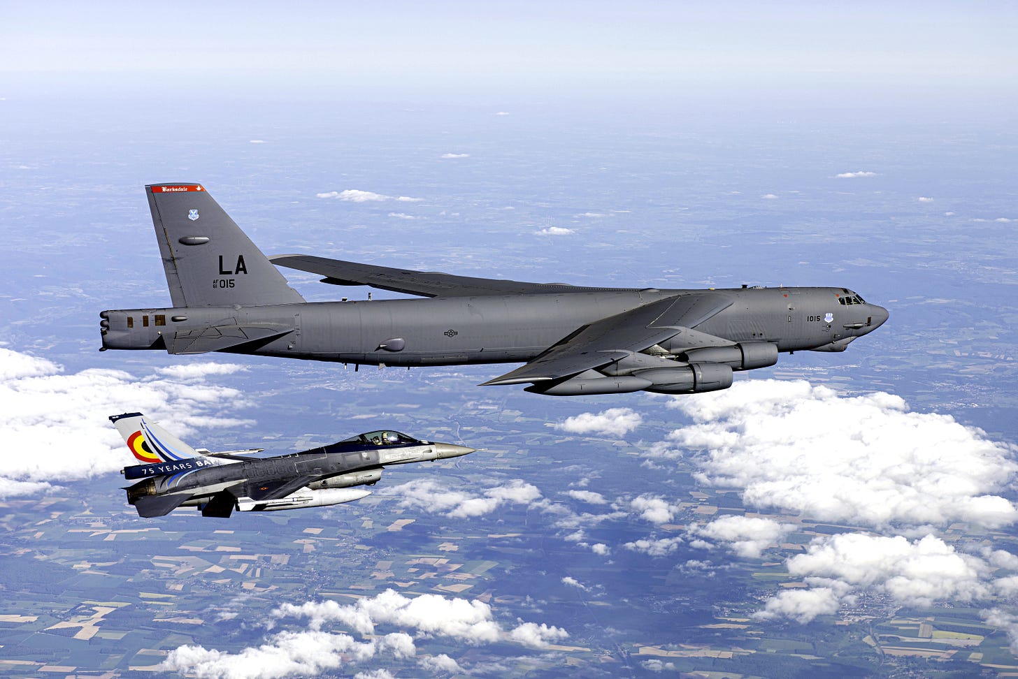 A B-52H Stratofortress operating out of Morón Air Base, Spain, is escorted by a Belgian air force F-16 Fighting Falcon