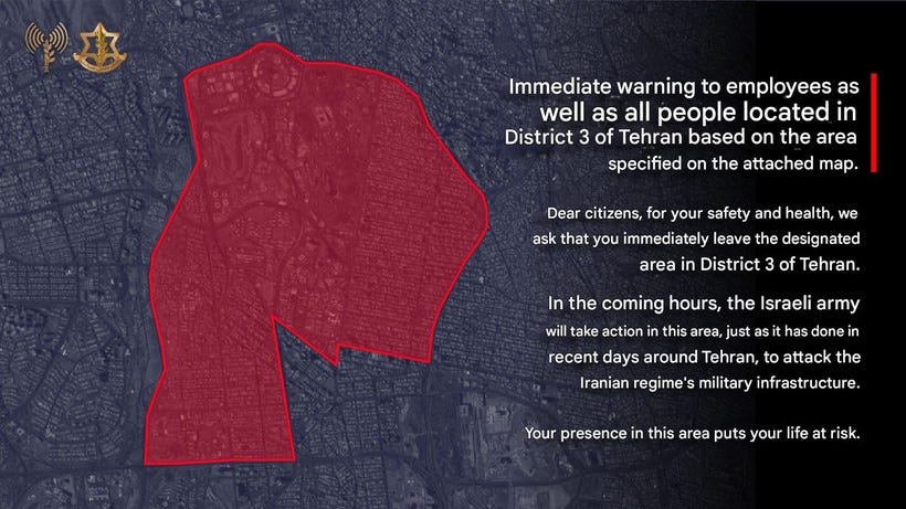 IDF: "We just published an evacuation warning in Farsi for civilians in Tehran. Israeli civilians do not get evacuation warnings before running to shelters. We aren’t the same."
