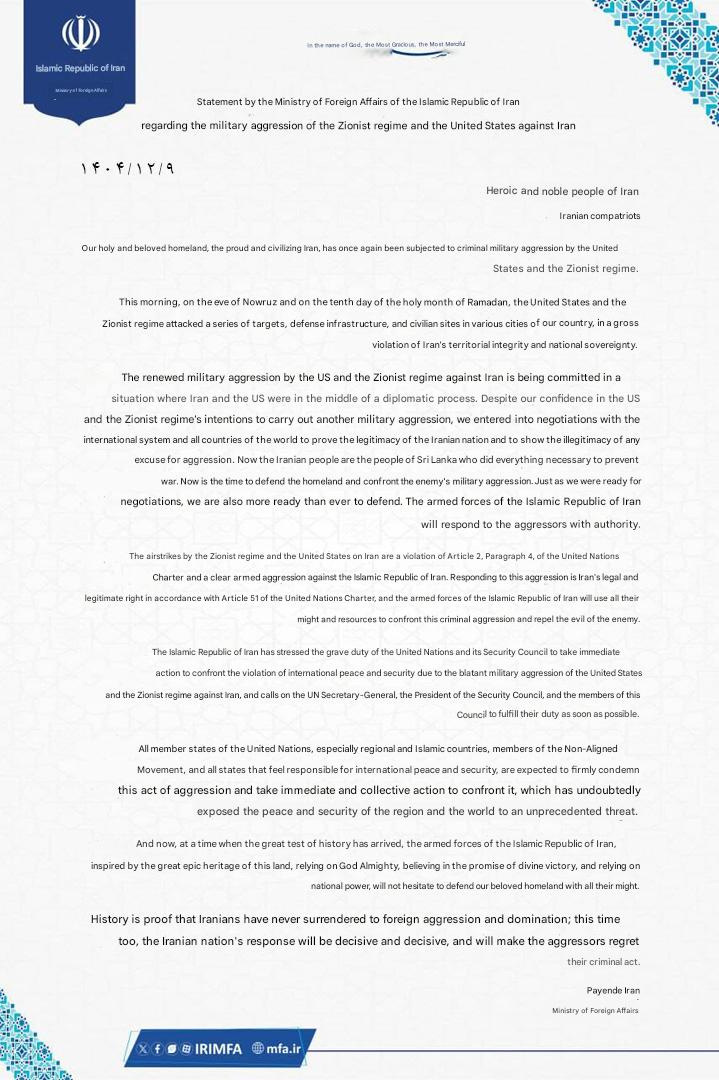 This morning, on the eve of Nowruz and on the tenth day of the blessed month of Ramadan, the United States and the Zionist regime, in flagrant violation of Iran’s territorial integrity and national sovereignty, attacked a range of objectives, defensive infrastructure, and non-military sites in various cities across our country.
