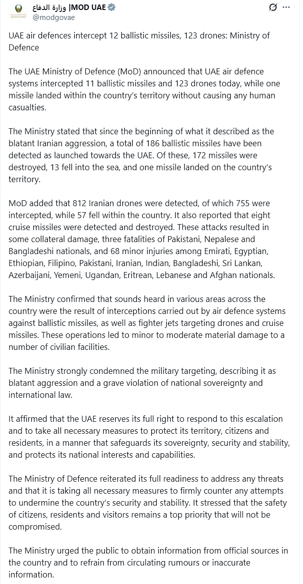 “The Ministry stated that since the beginning of what it described as the blatant Iranian aggression, a total of 186 ballistic missiles have been detected as launched towards the UAE. Of these, 172 missiles were destroyed, 13 fell into the sea, and one missile landed on the country’s territory. MoD added that 812 Iranian drones were detected, of which 755 were intercepted, while 57 fell within the country. It also reported that eight cruise missiles were detected and destroyed. These attacks resulted in some collateral damage, three fatalities of Pakistani, Nepalese and Bangladeshi nationals, and 68 minor injuries among Emirati, Egyptian, Ethiopian, Filipino, Pakistani, Iranian, Indian, Bangladeshi, Sri Lankan, Azerbaijani, Yemeni, Ugandan, Eritrean, Lebanese and Afghan nationals. The Ministry confirmed that sounds heard in various areas across the country were the result of interceptions carried out by air defence systems against ballistic missiles, as well as fighter jets targeting drones and cruise missiles. These operations led to minor to moderate material damage to a number of civilian facilities. The Ministry strongly condemned the military targeting, describing it as blatant aggression and a grave violation of national sovereignty and international law. It affirmed that the UAE reserves its full right to respond to this escalation and to take all necessary measures to protect its territory, citizens and residents, in a manner that safeguards its sovereignty, security and stability, and protects its national interests and capabilities. The Ministry of Defence reiterated its full readiness to address any threats and that it is taking all necessary measures to firmly counter any attempts to undermine the country’s security and stability. It stressed that the safety of citizens, residents and visitors remains a top priority that will not be compromised. The Ministry urged the public to obtain information from official sources in the country and to refrain from circulating rumours or inaccurate information.”