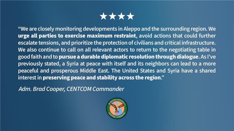 “We are closely monitoring developments in Aleppo and the surrounding region. We urge all parties to exercise maximum restraint, avoid actions that could further escalate tensions, and prioritize the protection of civilians and critical infrastructure. We also continue to call on all relevant actors to return to the negotiating table in good faith and to pursue a durable diplomatic resolution through dialogue. As I’ve previously stated, a Syria at peace with itself and its neighbors can lead to a more peaceful and prosperous Middle East. The United States and Syria have a shared interest in preserving peace and stability across the region.” — Adm. Brad Cooper, CENTCOM Commander