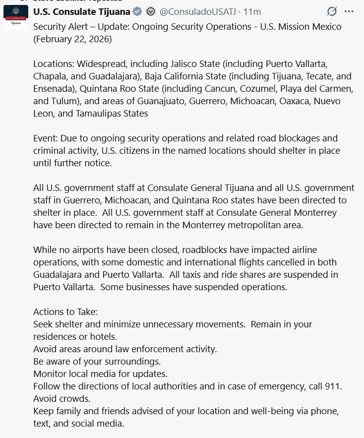 U.S. Consulate In Tijuana continues to advise shelter in place for American citizens within widespread locations in Mexico due to ongoing security operations.