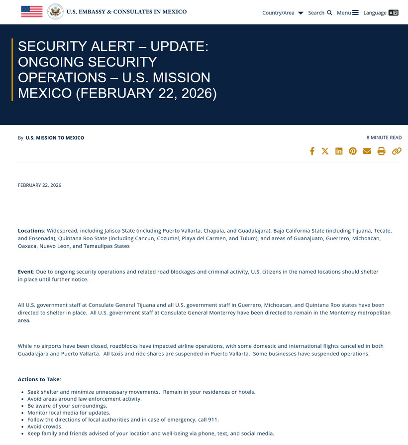 US Continues To Advise Shelter In Place In Widespread Locations Within Mexico