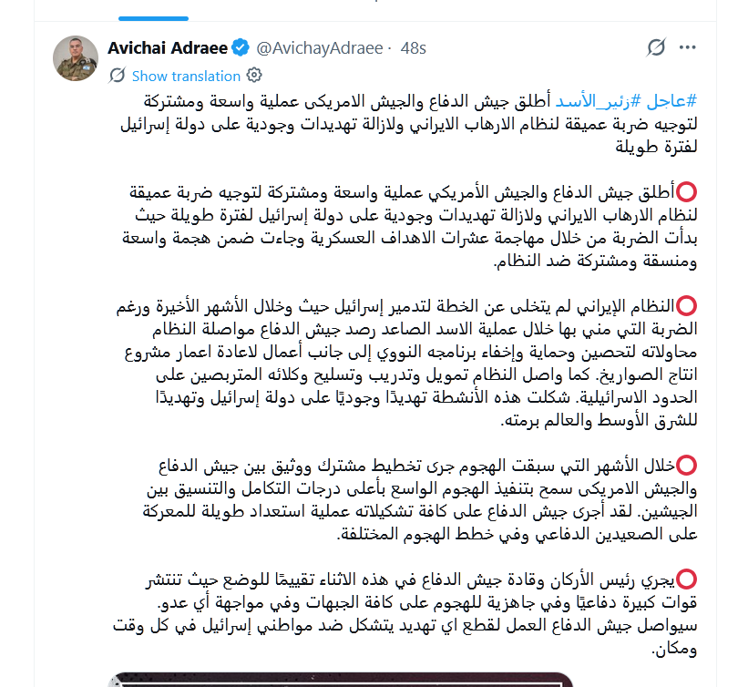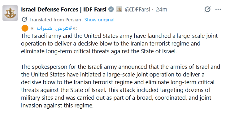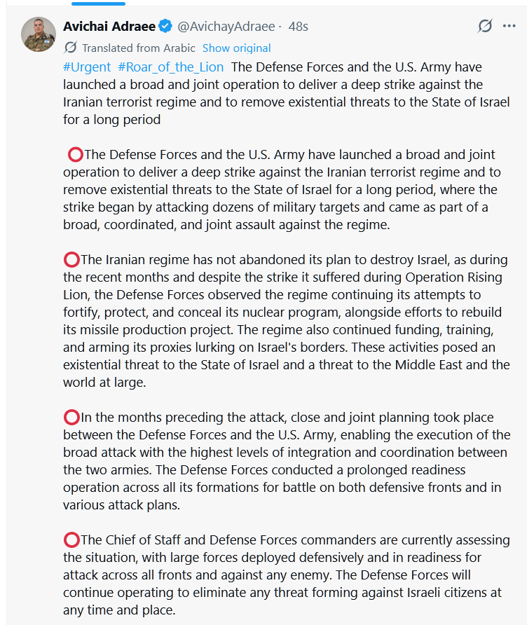 Avichay Adraee, IDF Arabic Spokesperson (February 28, 2026): “The Defense Forces and the U.S. Army have launched a broad and joint operation to deliver a deep strike against the Iranian terrorist regime and to remove existential threats to the State of Israel for a long period, where the strike began by attacking dozens of military targets and came as part of a broad, coordinated, and joint assault against the regime. The Iranian regime has not abandoned its plan to destroy Israel, as in the recent months and despite the strike it suffered during Operation Rising Lion, the Defense Forces observed the regime continuing its attempts to rebuild its nuclear program, protect and conceal its nuclear projects, and continue funding, training, and arming its terrorist proxies lurking on Israel’s borders. These activities posed an existential threat to the State of Israel and a threat to the Middle East and the world at large. In the months preceding the attack, close joint planning took place between the Defense Forces and the U.S. Army, enabling the execution of the attack with the highest levels of integration and coordination between the two armies. The Defense Forces conducted a prolonged readiness operation across all its formations for battle on both defensive fronts and in various attack plans. The Chief of Staff and Defense Forces commanders are currently assessing the situation, with large forces deployed defensively and in readiness for attack across all fronts and against any enemy. The Defense Forces will continue operating to eliminate any threat forming against Israeli citizens at any time and place.”